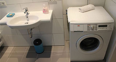 Im Badezimmer sind Dusche, WC und Waschbecken integriert. Zu Ihrer freien Verfügung stehen Waschmaschine, Föhn, Handtücher und Pflegeprodukte bereit. Das Gäste-WC ergänzt das Apartment mit WC und Waschbecken.