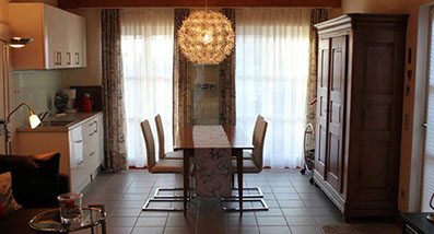 Die Küchenzeile ist ausgestattet mit Kühlschrank, 2-Platten-Induktionsherd und Mikrowelle. Des weiteren stehen ihnen bei uns Kaffeemaschine, Wasserkocher, Eierkocher und Toaster zur Verfügung. Kaffee, verschiedene Teesorten, Gewürze etc. sind für Sie vorrätig.