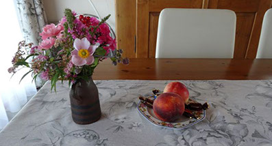 Frische Blumen und Obst